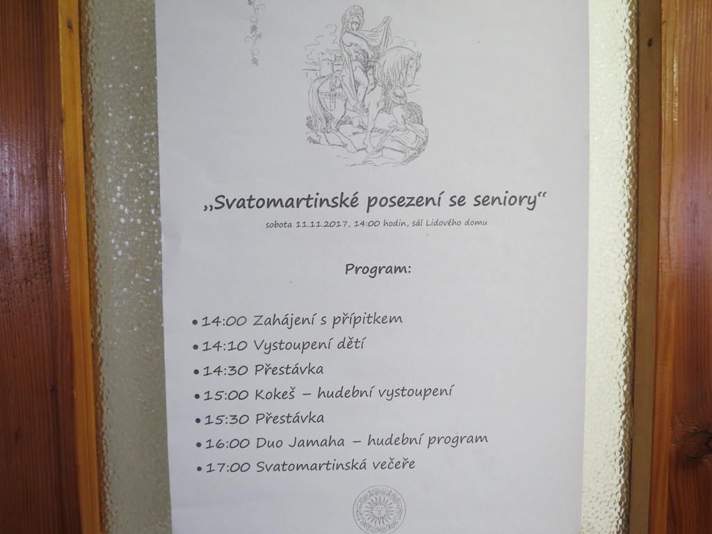V den sv. Martina přichystala obec v Lidovém domě pro své seniory „Svatomartinské posezení“. Kulturní program zahájilo taneční vystoupení dětí pod vedením Kristýny Šmatelkové. Program dále pokračoval hudebním vystoupením hudebního tělesa „Kokeš“ a kapelou Duo Jamaha, dobře známou z TV Šlágr. Připraveno bylo také bohaté občerstvení s večeří, u které nesmělo chybět svatomartinské víno.