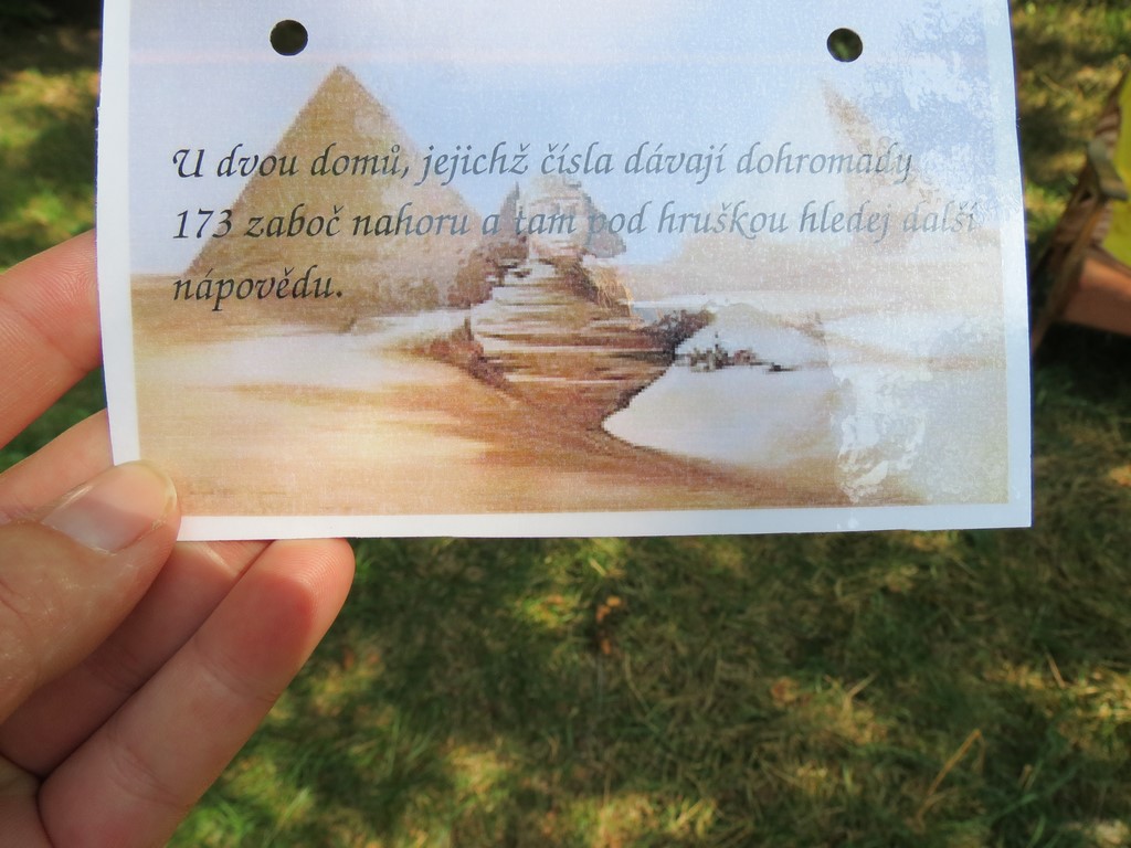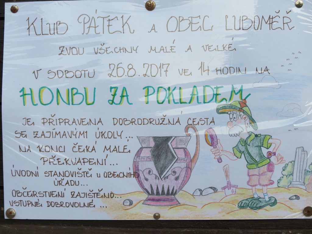 V sobotu 26.8.2017 se u příležitosti ukončení prázdnin u obecního úřadu sešli malí i velcí hledači pokladů, kteří se postupně vydávali na cestu plnou zajímavých úkolů a dobrodružství. Jednotlivé úkoly a stanoviště byly rozmístěny po celé vesnici. Někde děti našly pouze zašifrovanou nápovědu, kam dál, a jinde na ně čekali naši milí a ochotní archeologové, kteří pro ně měli připravené úkoly, za jejichž splnění opět získaly zašifrovanou nápovědu. Nakonec se všichni hledači úspěšně dostali do cíle a každý si odnesl svůj poklad. V cíli taktéž na všechny čekalo malé občerstvení.