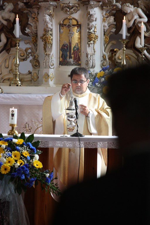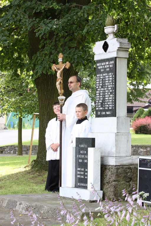 Slavnosti obce probíhaly i následující den, 13. července, tj. v neděli dopoledne. Program byl zahájen ve zdejším krásně vyzdobeném kostele (do žlutomodra – obecní barvy) sv. Vavřince. Mše byla sloužena jako poděkování obyvatel obce za její minulost, přítomnost a s prosbou za její budoucnost. Po skončení mše se vydal průvod farníků a občanů za doprovodu dechové hudby „Spálovanka“ z kostela k místnímu pomníku v parku u obecního úřadu. Zde proběhla krátká pietní vzpomínka na padlé (letos si totiž připomínáme 100. výročí od první světové války). Obřad pokračoval proslovem kněze a byl zakončen hymnou a položením věnce.